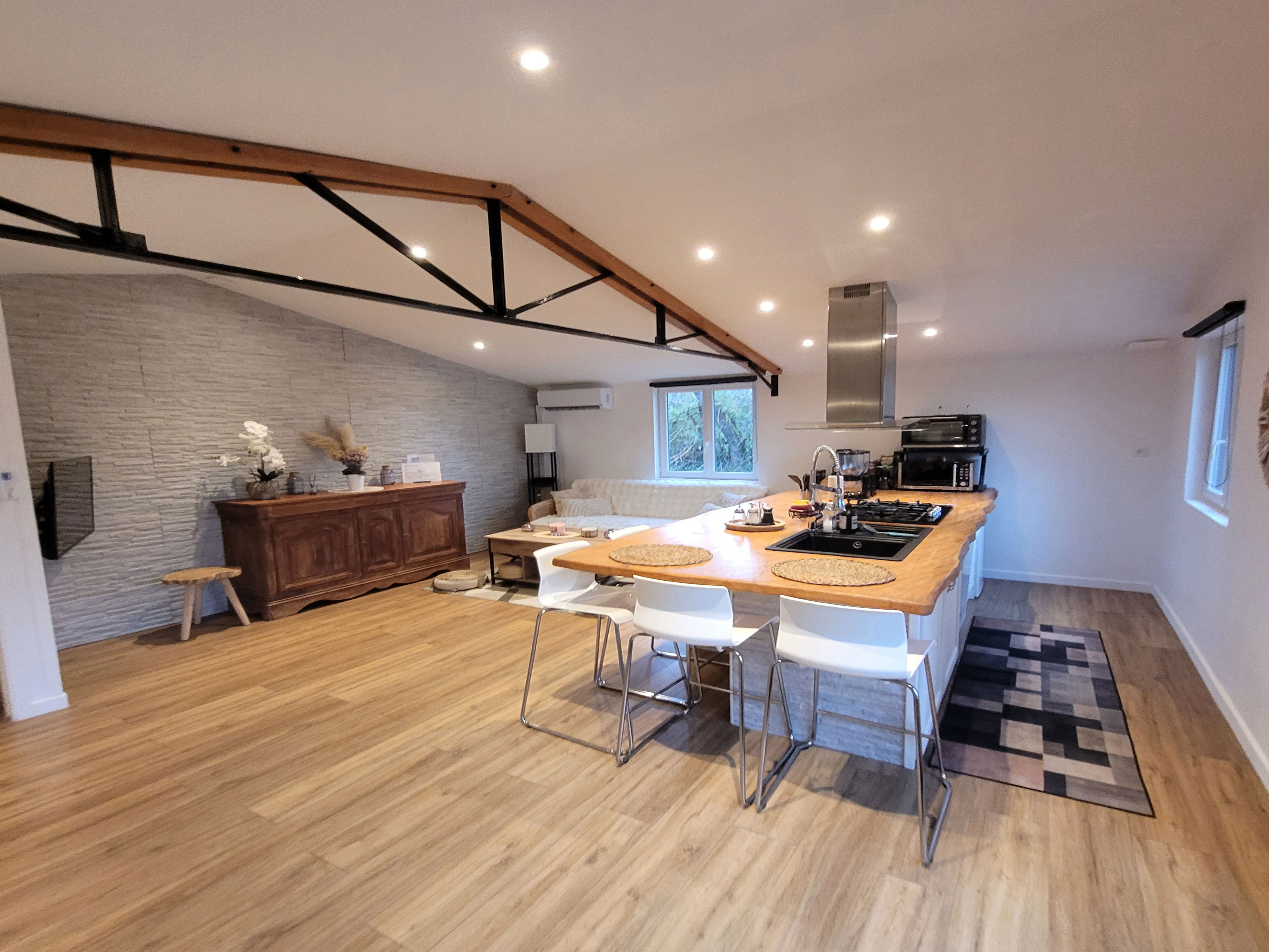 Situé à Guîtres, à 50 kilomètres du pont Chaban Delmas et de La Cité du Vin, ainsi qu'à proximité de Saint-Émilion, le Domaine La Tuilerie vous propose un gîte nommé L'Écrin Vert, classé quatre étoiles. Ce logement spacieux de 66 m², climatisé et niché en pleine forêt, dispose d’une terrasse ainsi que d’une connexion Wi-Fi gratuite. Un parking privé est mis à disposition sans frais supplémentaires. Par ailleurs, le Domaine La Tuilerie offre également la possibilité de louer des vélos pour explorer les environs. L'Écrin Vert comprend une cuisine entièrement équipée avec lave-vaisselle, lave-linge, four traditionnel et micro-ondes. La salle de bains privative est aménagée avec peignoirs, serviettes de bain et sèche-cheveux. Afin d’assurer une plus grande intimité, l’hébergement bénéficie d’une entrée indépendante. Vous pourrez profiter de la piscine extérieure, pratiquer la randonnée, vous détendre dans le jardin ou utiliser le barbecue tout en appréciant une agréable vue sur le parc arboré. D’une capacité d’accueil de deux personnes, ce logement est doté d’un lit King Size confortable ainsi que d’un canapé-lit. Il comprend également une salle de bains avec douche privative, des toilettes séparées et une télévision installée aussi bien dans le salon que dans la chambre.